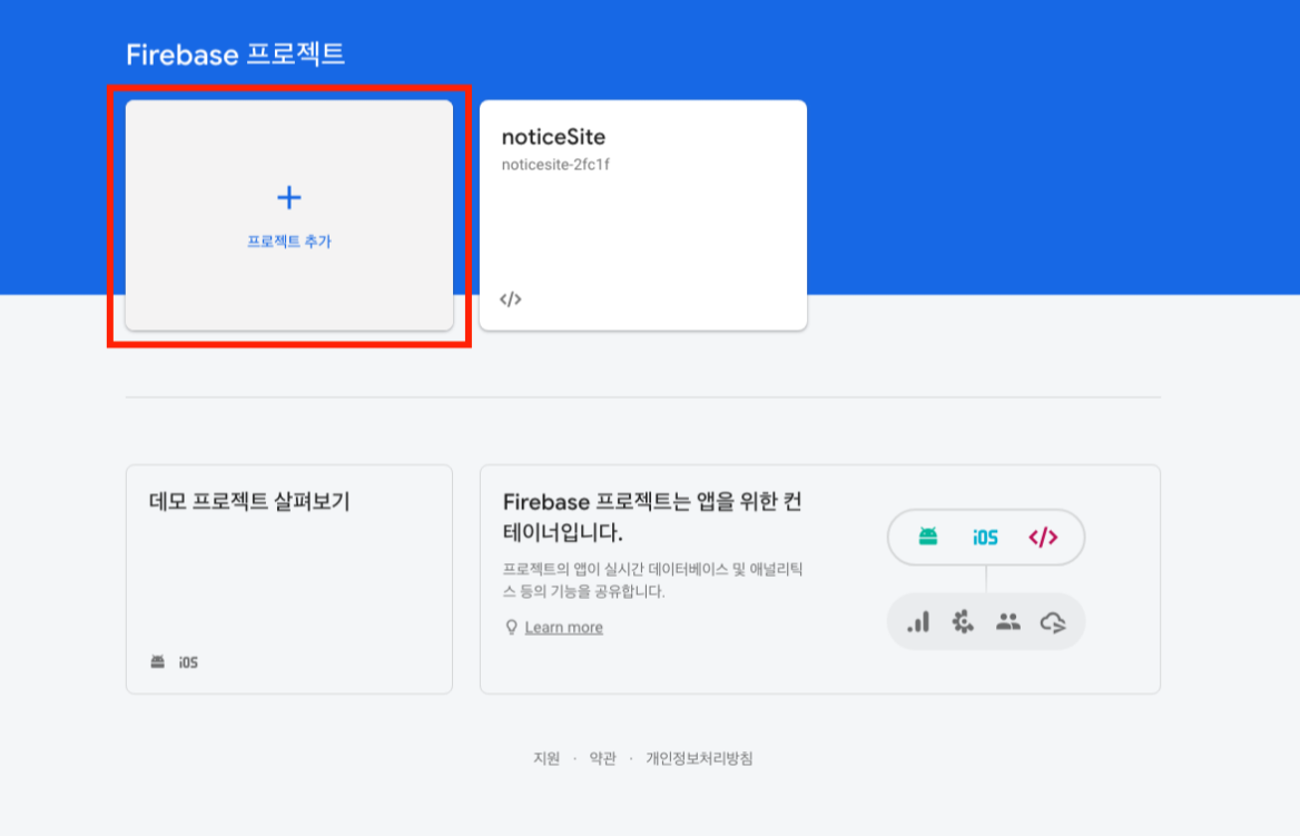 1. Firebase 사이트(https://firebase.google.com/)에 접속한 후 [시작하기] 를 클릭해준다.