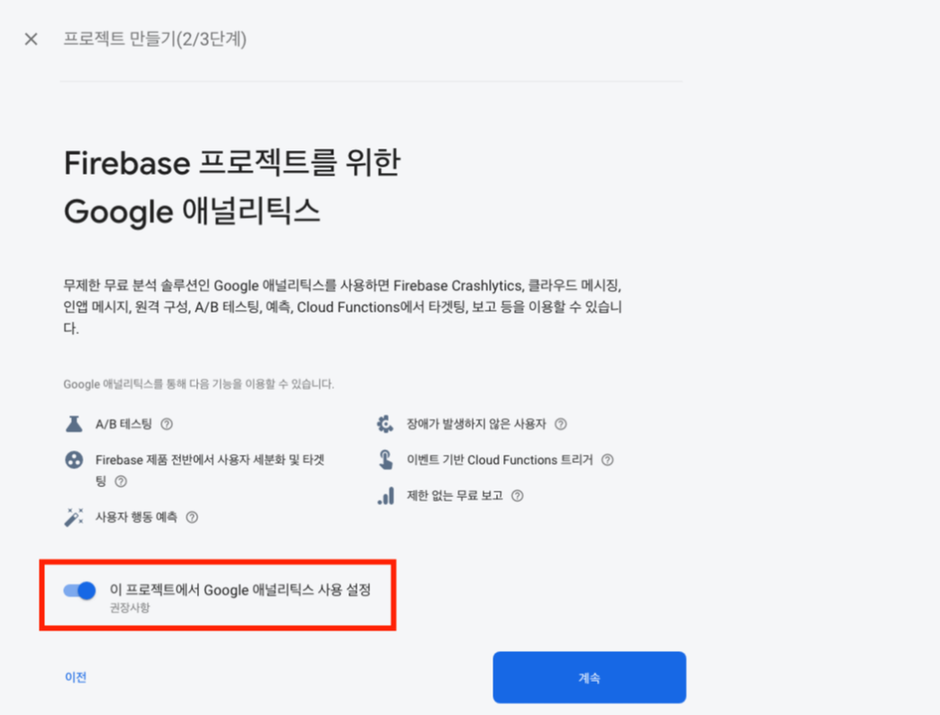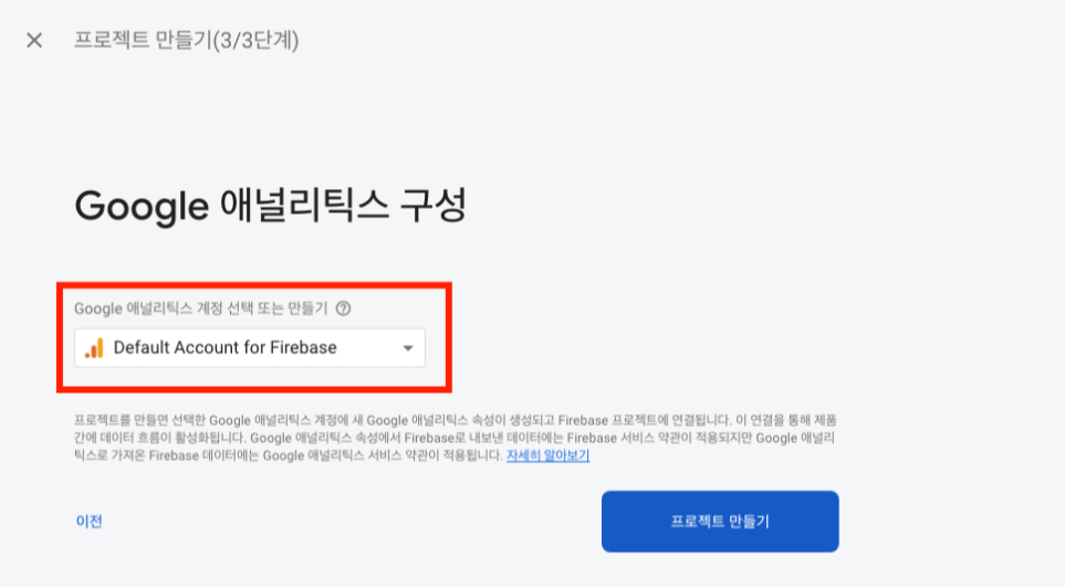 4. 애널리틱스 사용 설정 -> 애널리틱스 계정 선택 후 [프로젝트 만들기] 를 누른다.