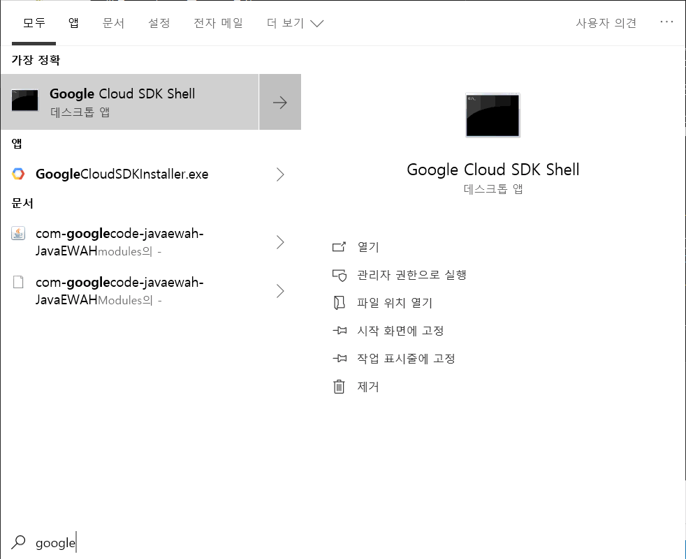 2. 검색창에서 "Google Cloud SDK Shell"를 검색한 후 "Google Cloud SDK Shell" 을 실행한다.