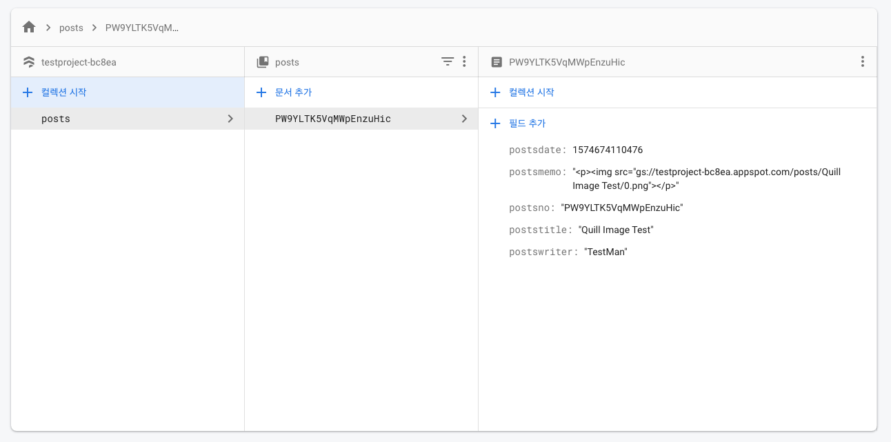 2. firebase db 에 새로 추가된 데이터의 postsmemo 의 이미지 링크가 "gs://~~" 로 변하여 들어간 것을 확인할 수 있다.