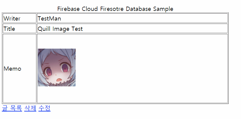 3. 글 목록에서 새롭게 추가된 글을 눌러 내용을 확인한다. Read 부분에서 "gs://~~" 링크가 firebase storage 의 다운로드 링크로 변하여 들어가진다.