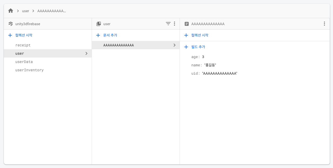 Unity3d 에서 PostUserDataSave 함수를 실행시켰을때 자신의 Firebase Console 에서 Database - Cloud Firestore에 아래와 같이 데이터가 들어온다면 잘 연결된 것이다.
