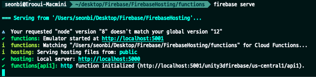 Unity3d 구성까지 끝냈다면 터미널에서 firebase serve 명령어를 firebase hosting 프로젝트 폴더/functions 폴더에서 실행시켜 서버를 실행시킨 후 Unity3d 와 서버와 통신을 한다.
