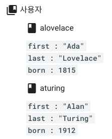 사용자 이라는 컬렉션 아래에 alovelace, aturing 이라는 문서가 존재한다.