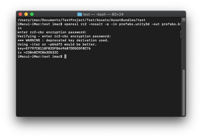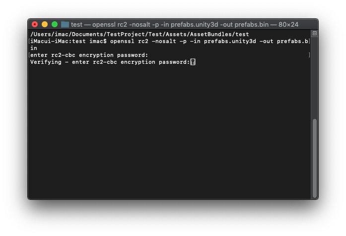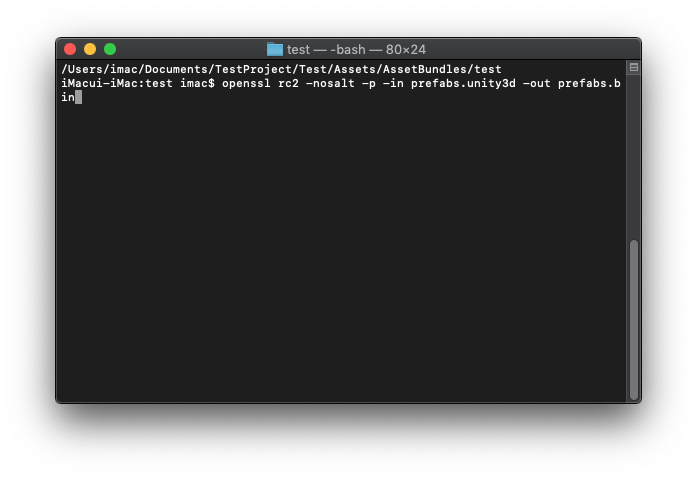 $ openssl rc2 -nosalt -p -in 에셋번들이름.unity3d -out 에셋번들이름.bin