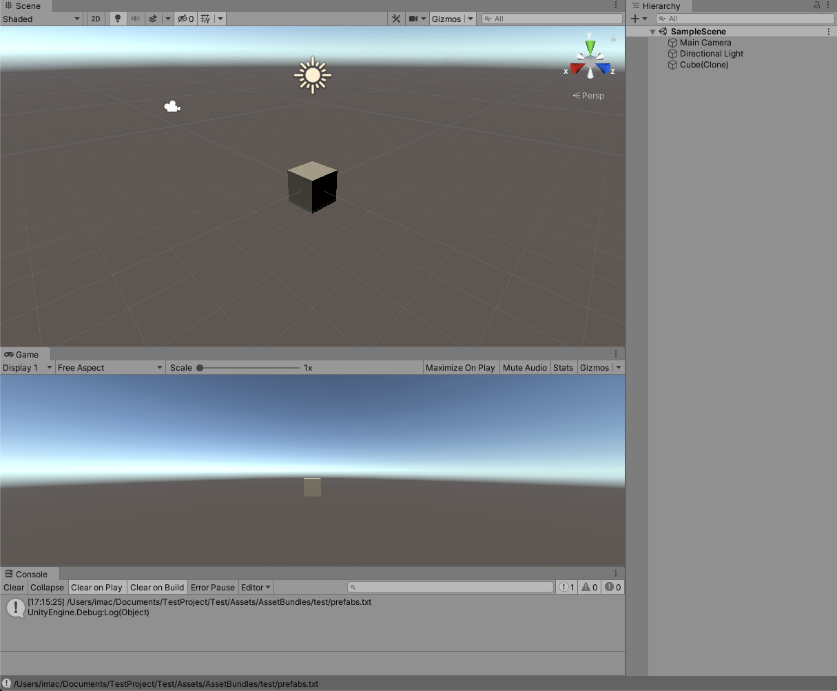 아래와 같은 스크립트를 제작한 후 실행시키면 에셋번들이 잘 로드되어 생성되는 것을 볼 수 있다.