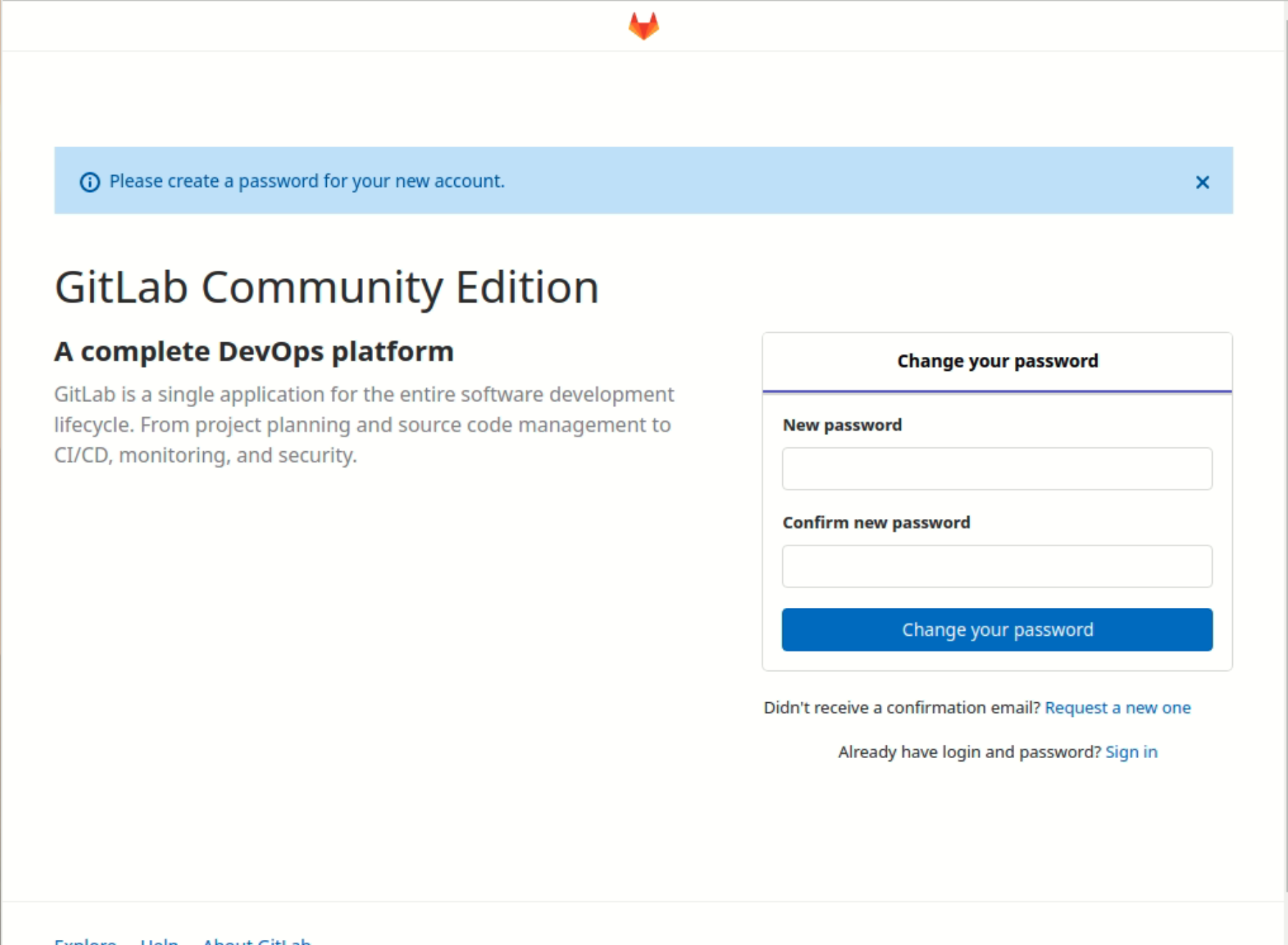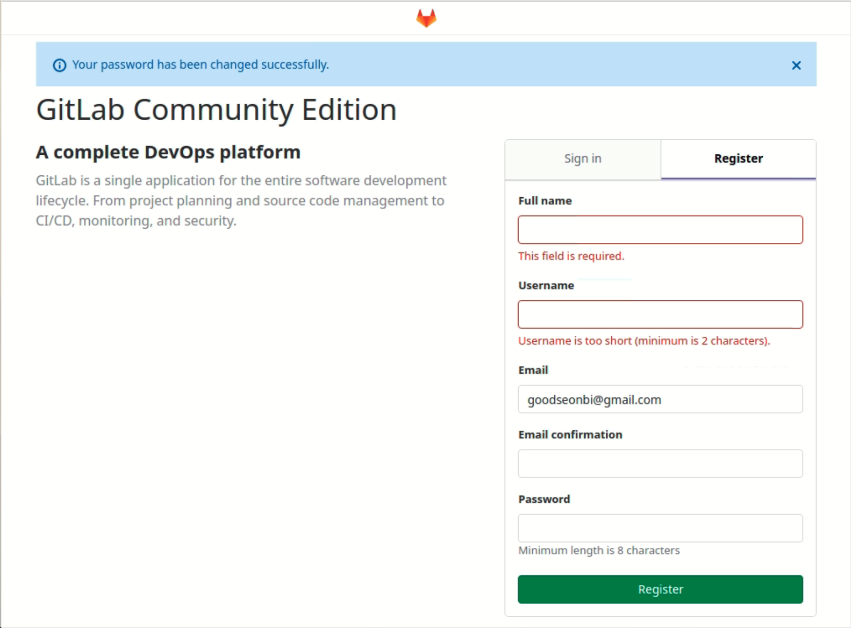 를 입력하라고 하는데 이 글을 보는 사람들은 대부분 서버를 호스팅해서 서버를 운영할 것이 아니고 개인 서버에서 운영할 것이기 때문에 https://gitlab.example.com 부분을 자신이 가지고 있는 도메인 or ip로 포트를 붙여서 접속을 하자.