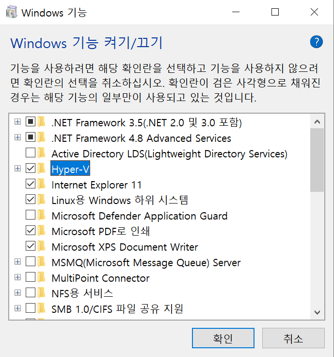 먼저 Hyper-v 를 활성화 시켜줘야한다.