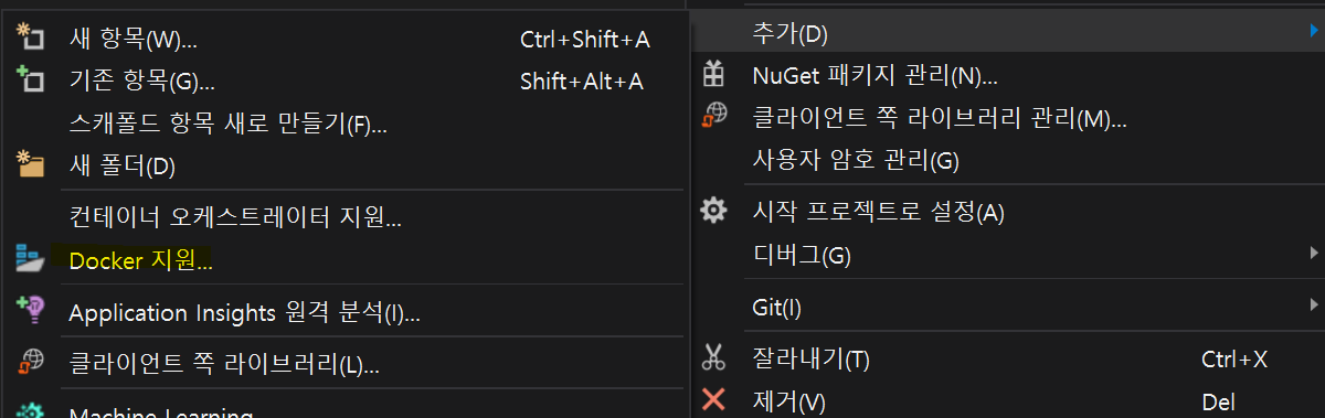 Visual Studio를 사용하는 경우 프로젝트을 오른쪽 클릭 후 추가 - Docker 지원 을 선택한다.