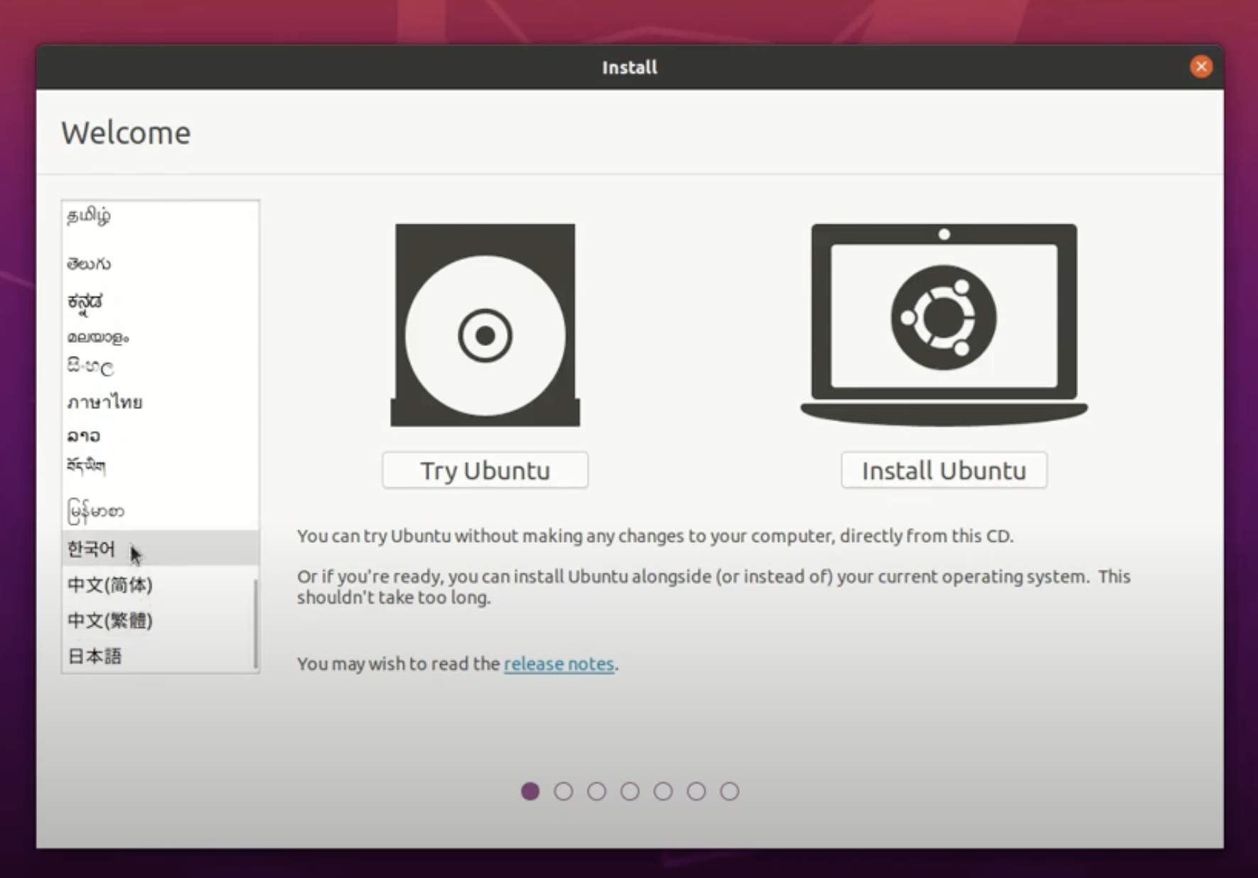 Install Ubuntu 선택. 기본적으로 영어로 설정되어 있지만 아래쪽에 한국어 를 선택하여 진행할 수 있다.
