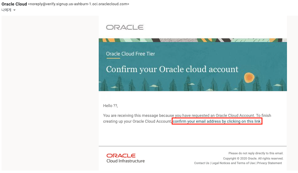 자신이 입력한 이메일에 도착한 오라클 이메일의 링크를 클릭하여 나머지 회원가입을 계속 진행한다.