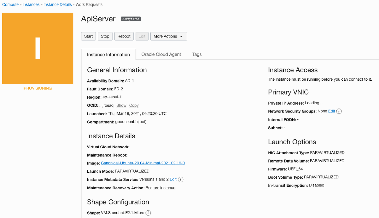 provisioning 이라 뜨며 제작 요청한 서버를 준비중이다.
