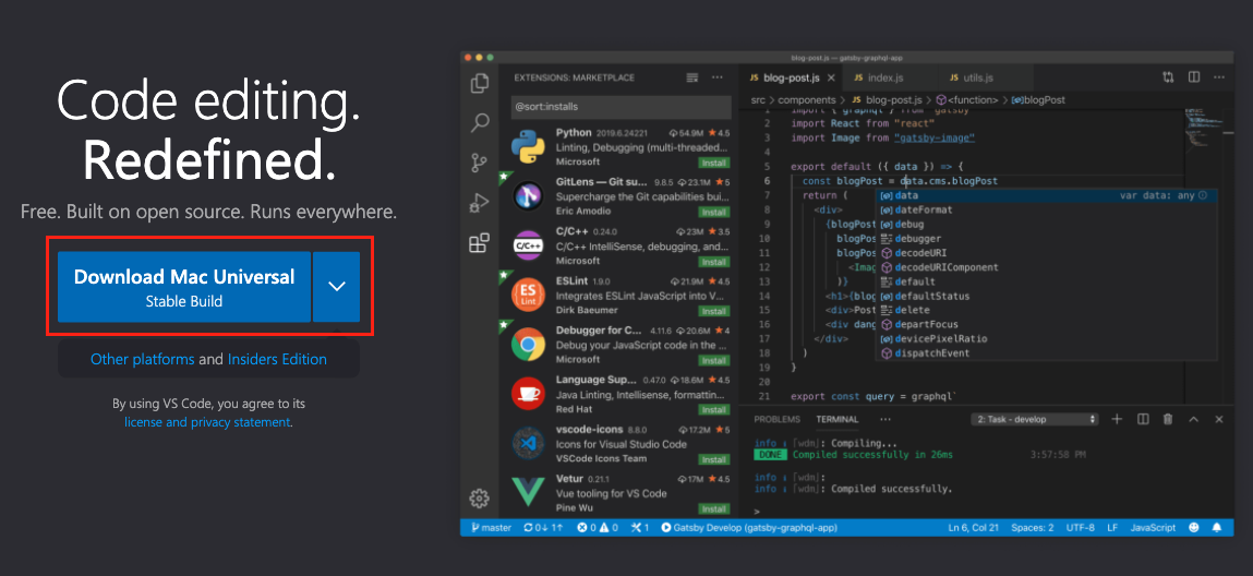 Visual Studio Code is a code editor redefined and optimized for building and debugging modern web and cloud applications. Visual Studio Code is free and available on your favorite platform - Linux, macOS, and Windows.