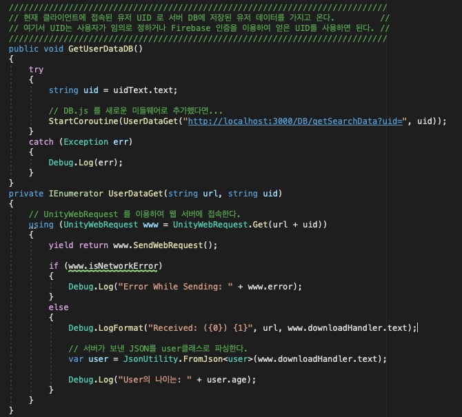 구동 방식은 유저정보 가져오기를 누르면 DatabaseServer GameObejct 에 있는 DatabaseServer.cs의 GetUserDataDB() 함수를 실행이 되며 우리가 서버에 구현한 아래의 /getSearchData 에 신호를 보낸다.