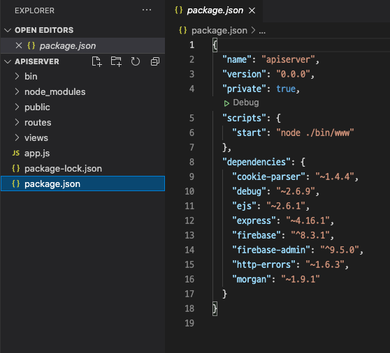 firebase, firebase-admin 의 설치가 끝나고 package.json 을 확인하면 방금 설치한 2개의 패키지가 종속성에 포함된 것을 확인할 수 있다.