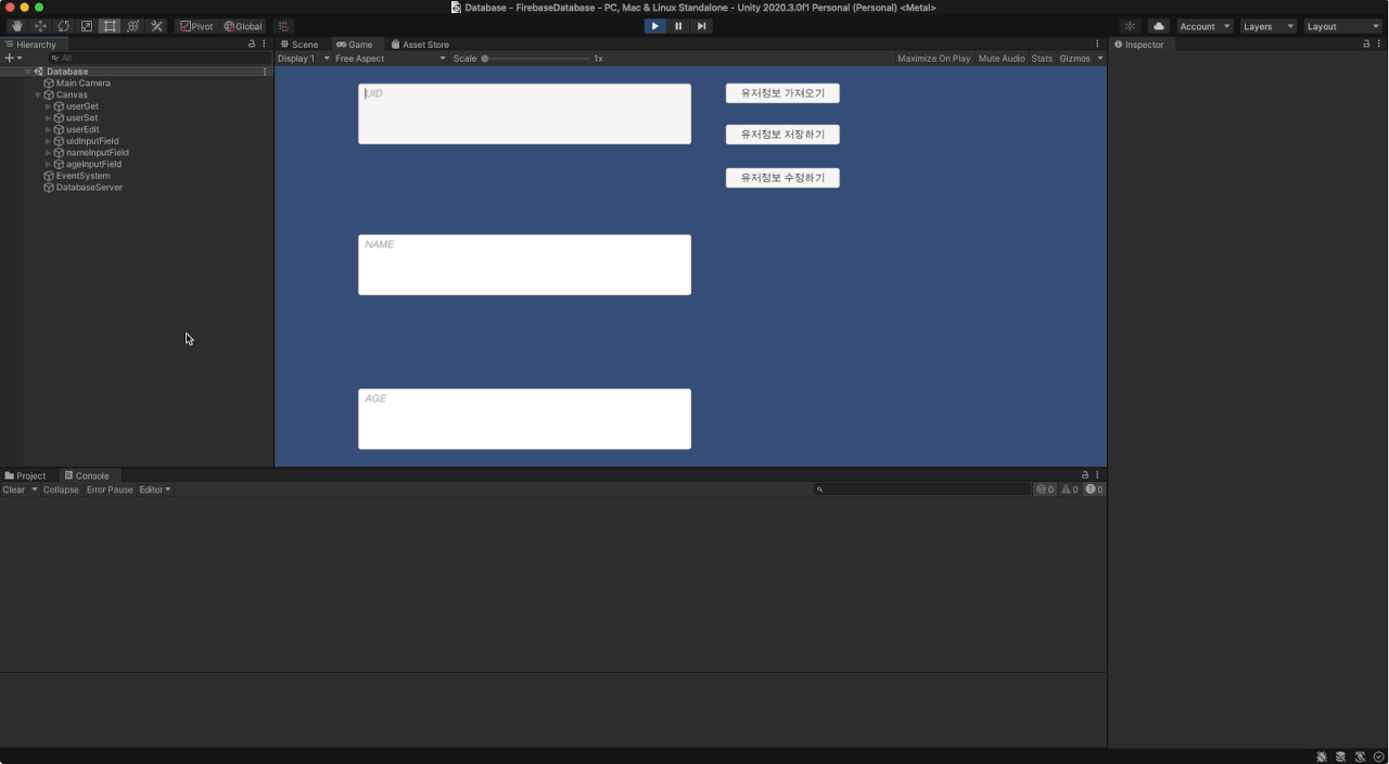 클라이언트(Unity3d)에서는 데이터만 서버에 보내주고 서버에서 Database 기능을 사용할 예정으로 Web App과 Firebase Database 세팅을 한다.