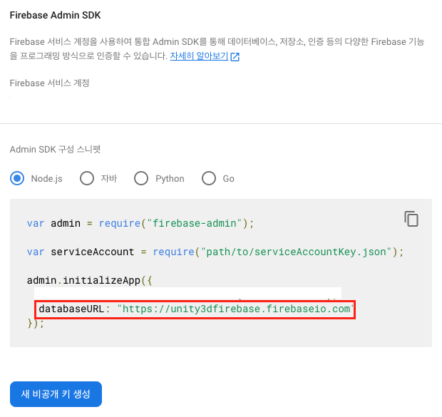 databaseURL 의 경우 admin key 다운로드 받는 위치에 있다.