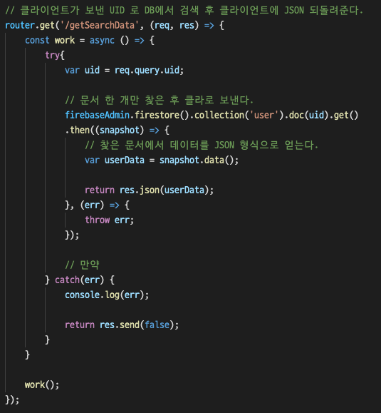 // 클라이언트가 보낸 UID 로 DB에서 검색 후 클라이언트에 JSON 되돌려준다.