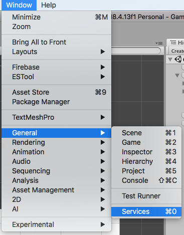 먼저 Unity3d 프로젝트로 돌아온 후 Window - General - Services 를 연다.