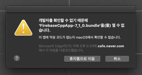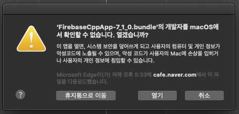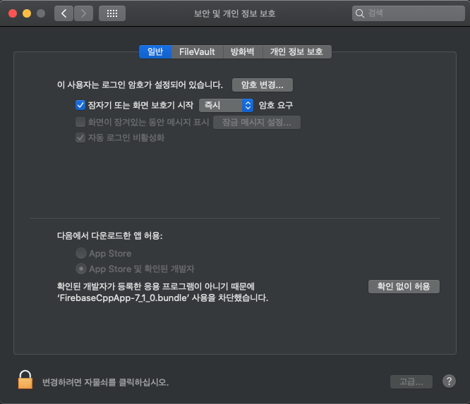 라는 에러가 발생한다면 맥 시스템 환경설정 - 보안 및 개인 정보 보호 에서 확인 없이 허용을 눌러줘야한다.