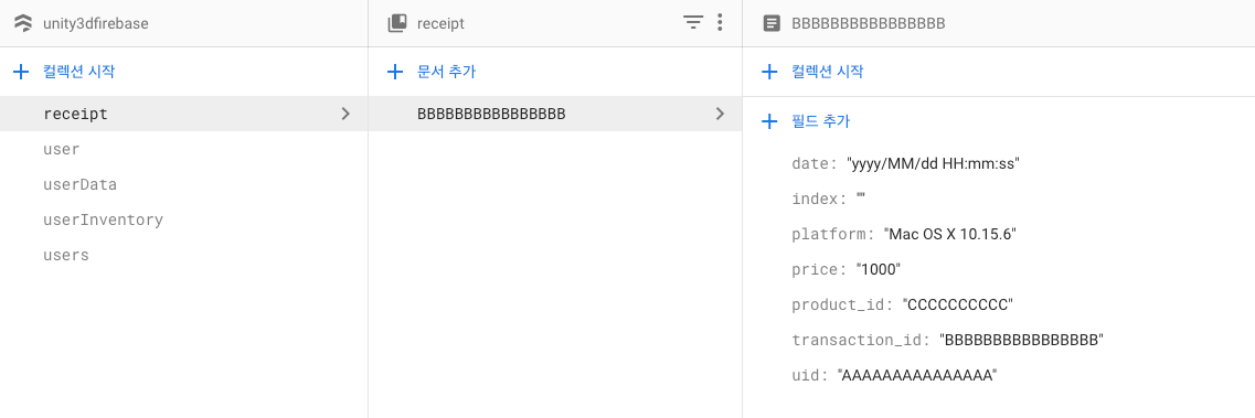아무 문제 없이 실행이 된다면 예제 프로젝트를 안드로이드 apk로 빌드한 후 Firebase Firestore 에 영수증 정보가 제대로 입력이 되는 확인 해본다.