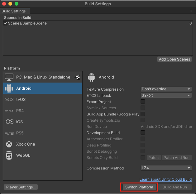 인제 Build Settings 에서 Android 로 Switch Platform 을 하자.