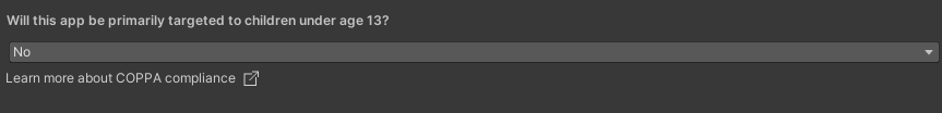현재 만드는 앱의 타겟이 13세 이하 어린이들이 대상인가요? 물음에는 No 를 선택하자.